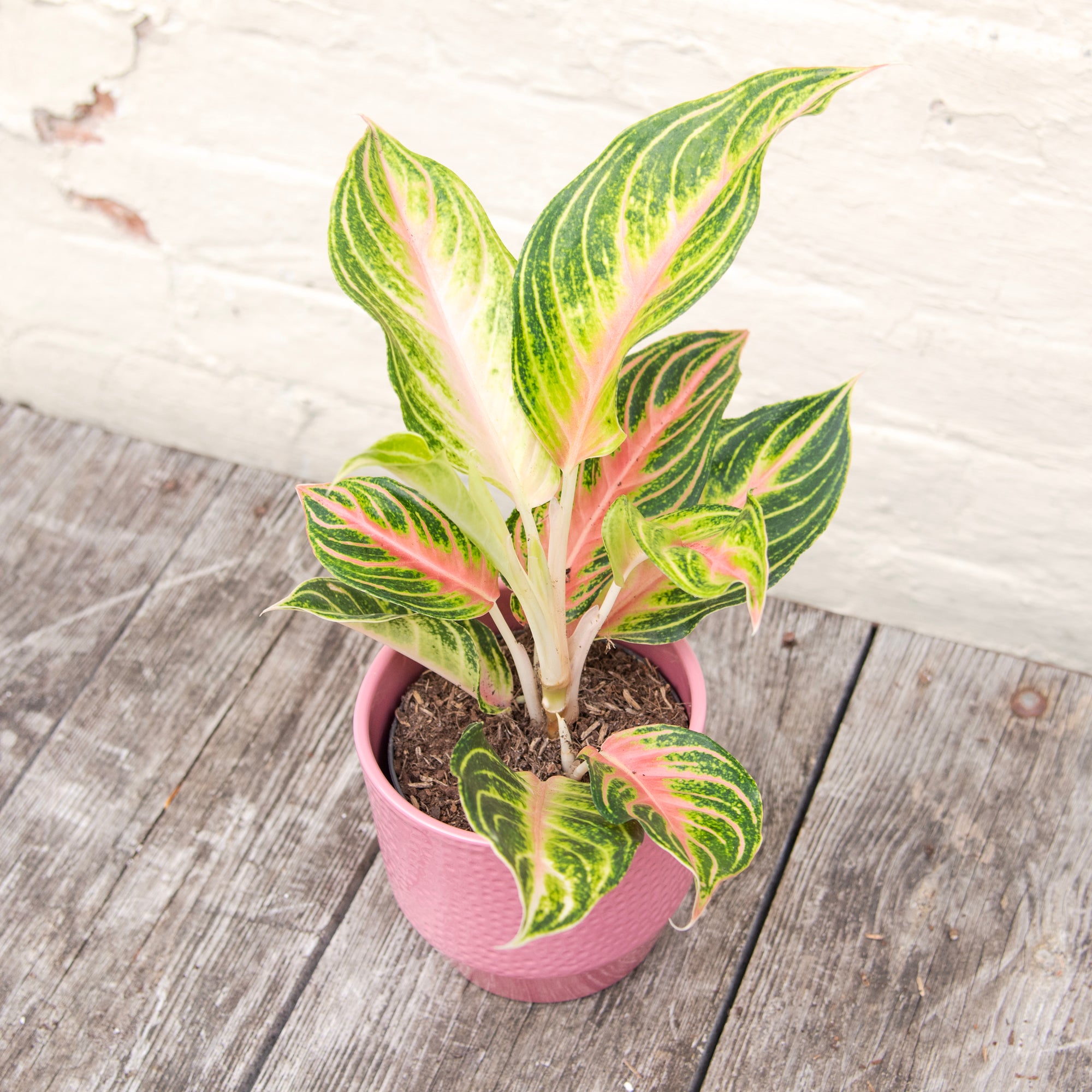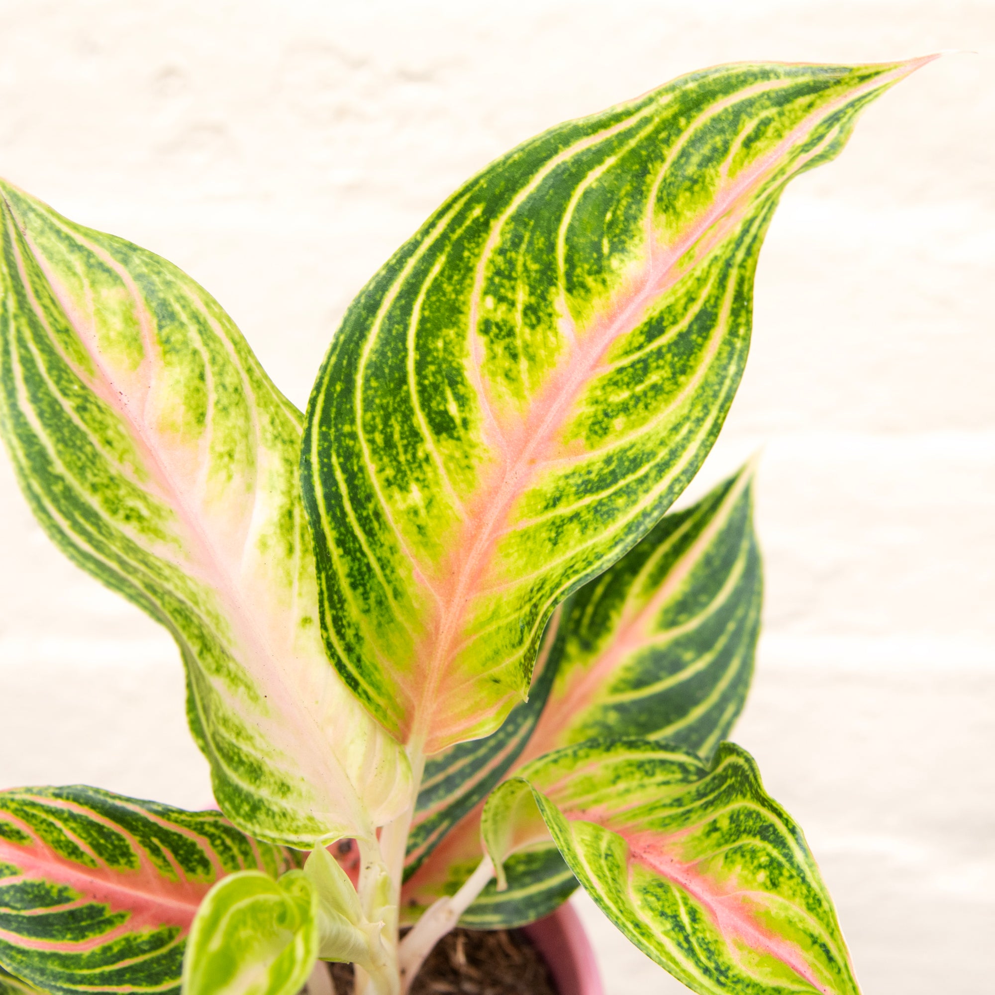 Aglaonema 'Coco Green' is an uncommon variety of Chinese Evergreen with vibrant striped leaves in green and pink - a really unusual and bold plant, sure to stand out from the rest of your collection.