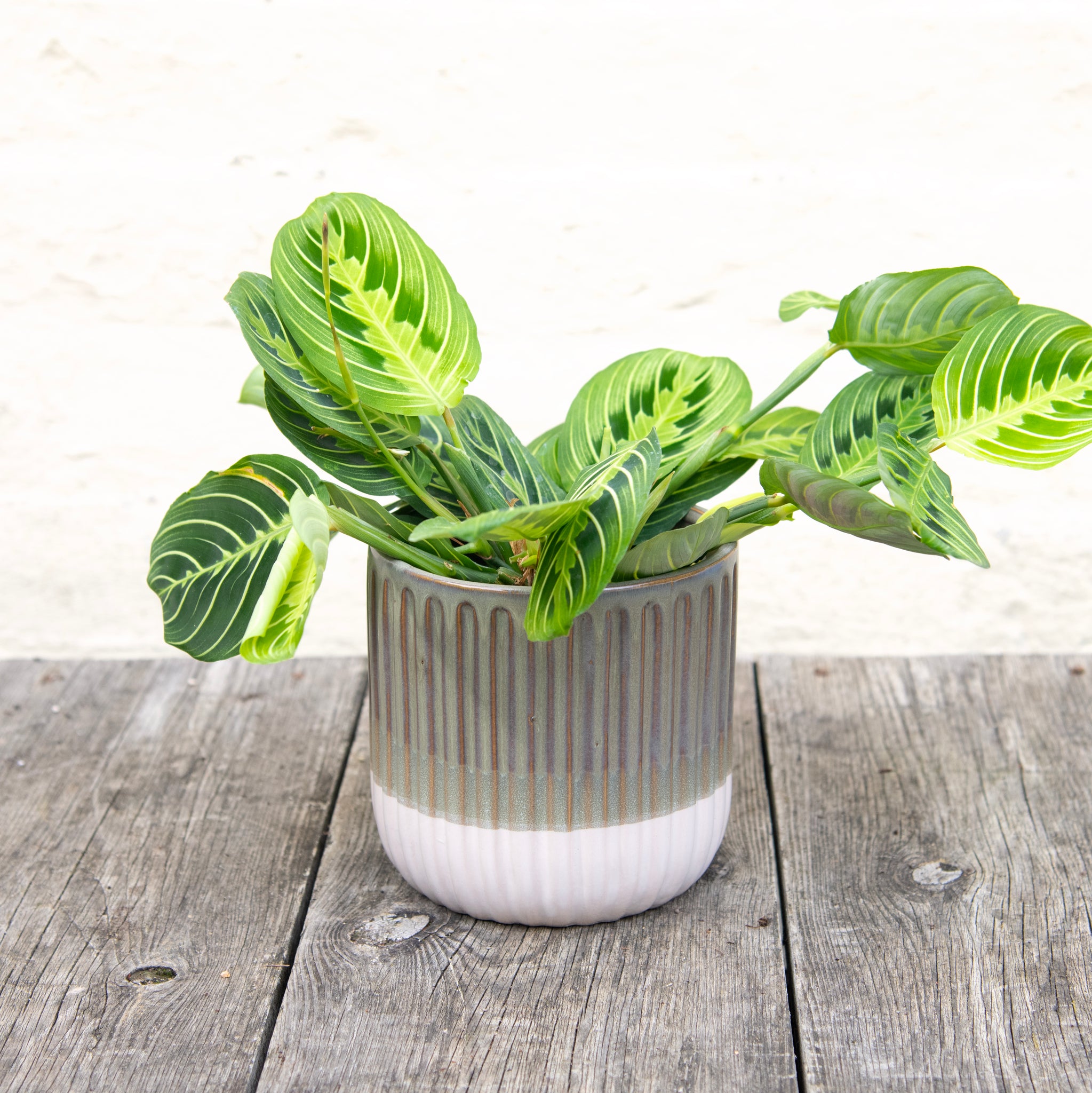 This 'Lemon Lime' version has two toned green leaves with bold veining - which you will see in the evenings when they stand upright and this plant goes in to its 'prayer' pose.