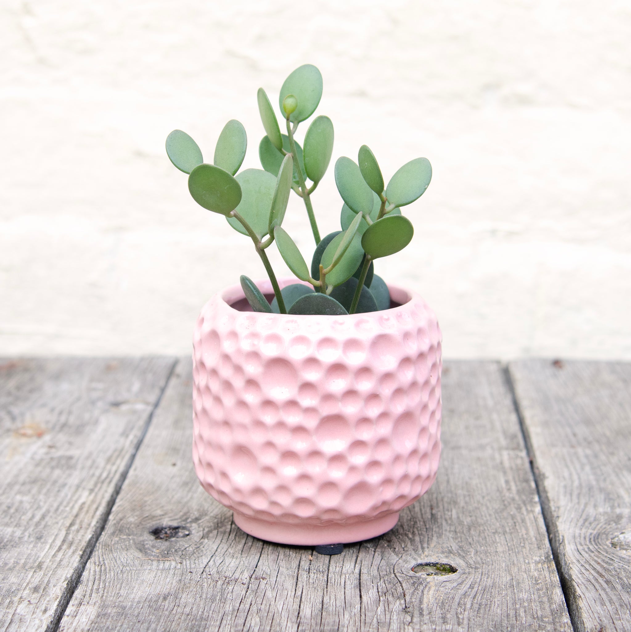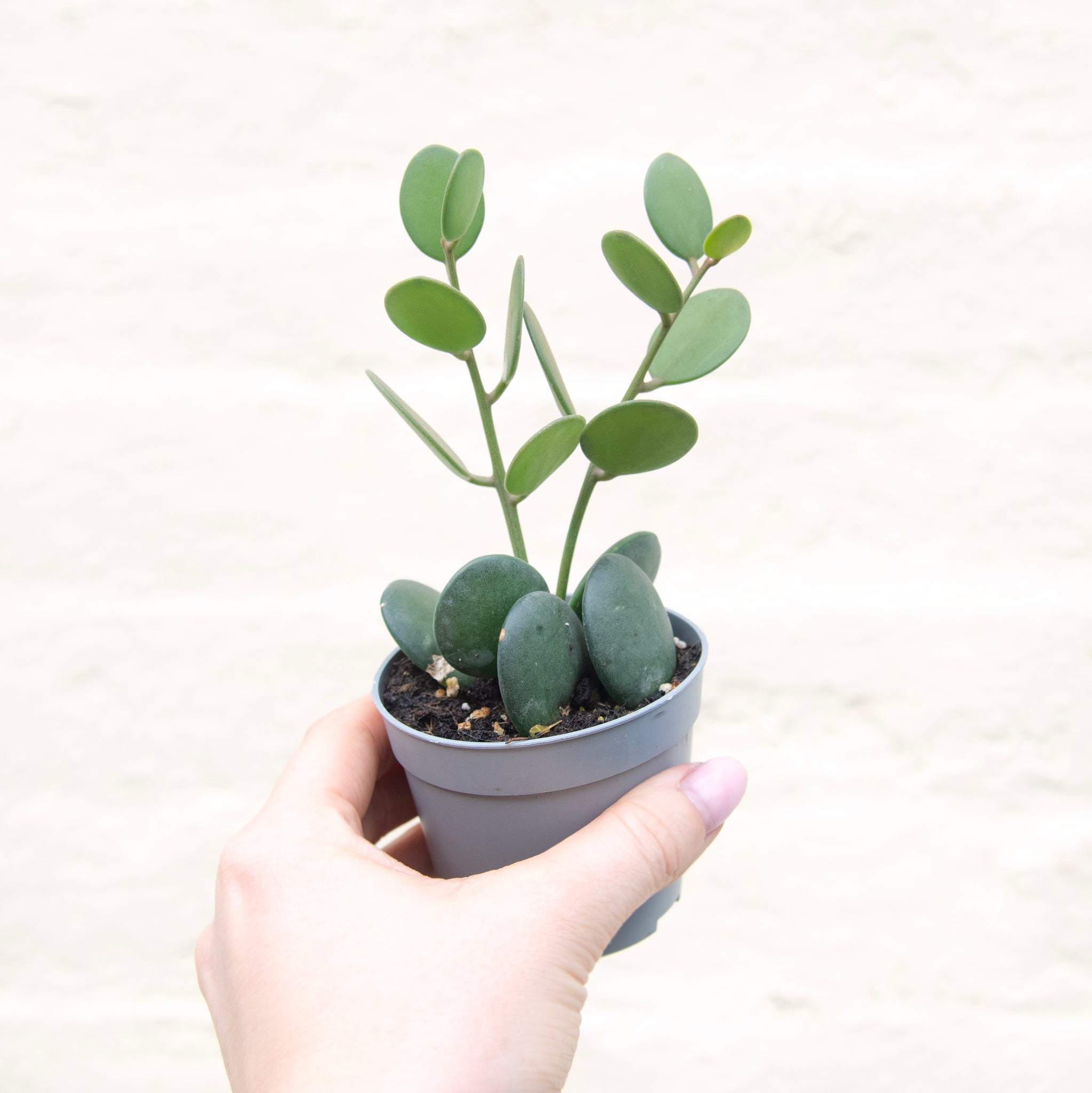 This uncommon succulent plant has thick round leaves, alternating up woody stems. It can either be trained around a trellis or left to hang downwards under their own weight.