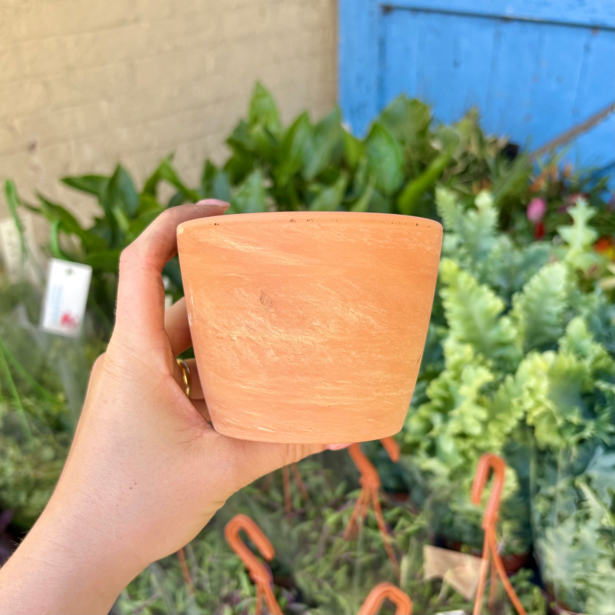 These terracotta 'Swirl' cover pots fits our plants in a maximum of 10cm diameter plastic pots, they also fit our 8cm nursery pots.