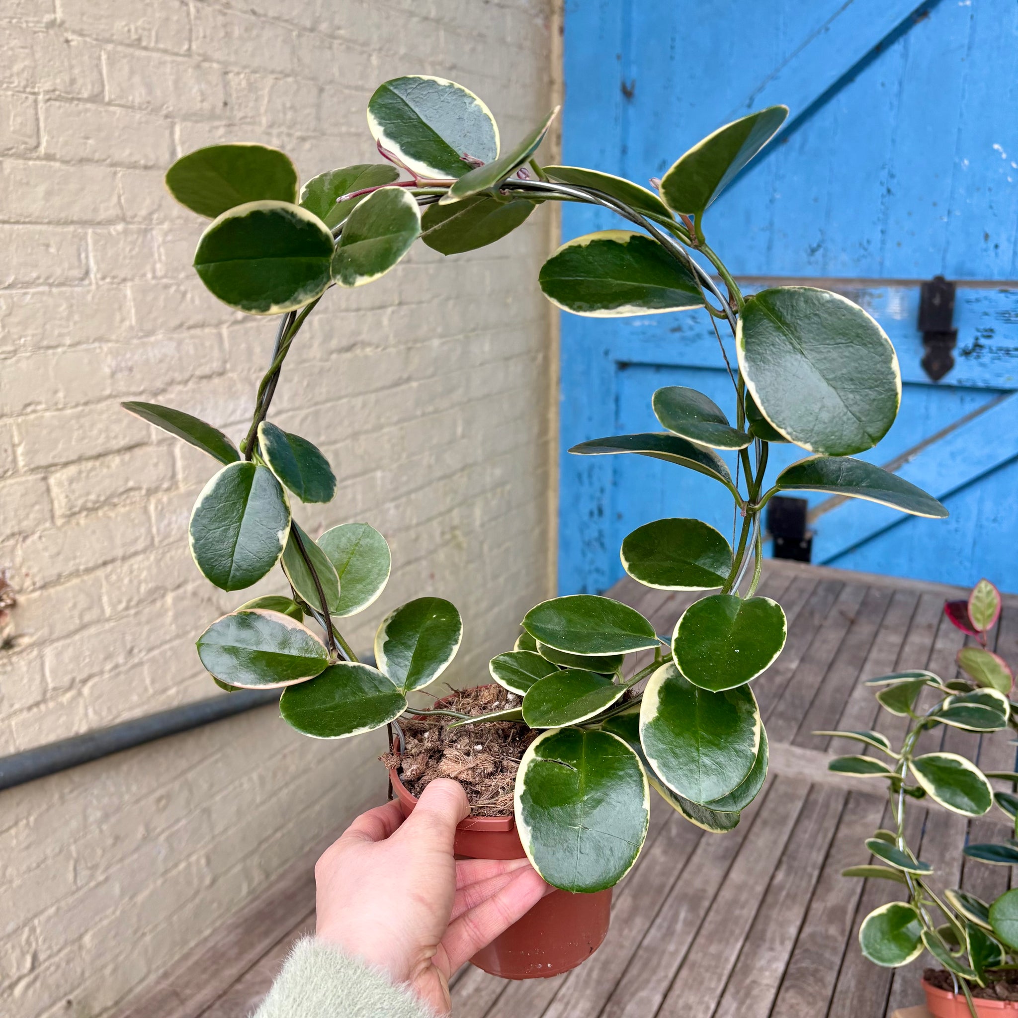 The Hoya Australis 'Blondie' is characterised by it's variegated leaves, outlined with creamy white. The better light you give this plant the more vibrant the colours will be.